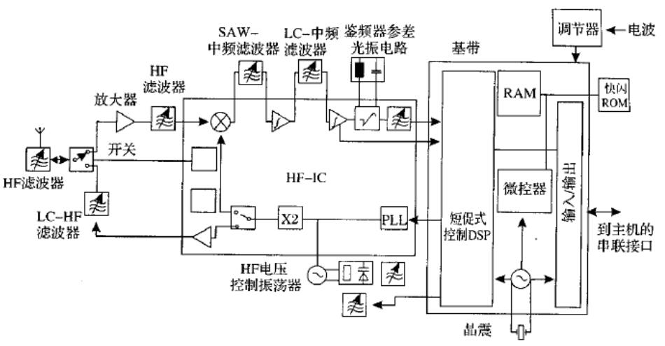 圖1藍(lán)牙無線電系統(tǒng)(最少兩個(gè)芯片)的典型方案右邊為基帶處理器,左邊為高頻模塊,附加濾波器和天線開關(guān)元件