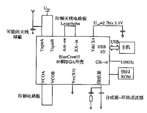 目前所有藍(lán)牙系統(tǒng)中天線的接收機(jī)╱發(fā)射機(jī)之間的高頻功能元件不是安在芯片上的。BlueCore模塊也不例外,但整個(gè)芯片是用CMOS技術(shù)制造的,接收機(jī)具有比雙極技術(shù)制造的設(shè)備的線性高得多,所以對濾波器實(shí)現(xiàn)較簡單。
