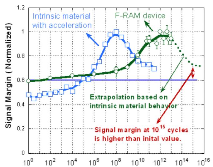 圖1.FRAM器件和本征材料的信號裕量與周期的關系圖顯示,與初始值相比,FRAM器件在1015個周期時的信號裕量更高。