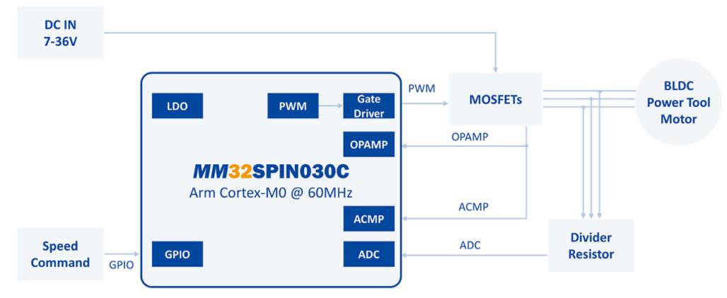 MM32SPIN030C,Arm® Cortex-M0內(nèi)核,最高工作頻率可達(dá)60MHz,內(nèi)置存儲器32KB Flash和4KB SRAM,具有1 路 12 位模數(shù)轉(zhuǎn)換器 ADC,支持 11 通道,采樣速率 1Msps,4 個通用定時器,1 個針對電機(jī)控制的 PWM 高級定時器,支持 UART/SPI 通信,針對電機(jī)應(yīng)用內(nèi)置 2 個運(yùn)放、2 個比較器,內(nèi)置三相 P/N 柵極驅(qū)動器。