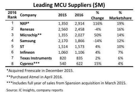 隨著物聯網領域應用對MCU需求的進一步增長。為了搶占市場份額,供應商們進行了多次的并購,并最終改變了MCU的供應商排名。根據IC Insights的統計,全球最大的MCU供應商由收購了Freescale的NXP擔當,而Microchip、Cypress也通過收購,提高營收,擴大了在MCU市場的份額。但因為在2016年,MCU的增長并沒有那么明顯,那就沒有更多的收購事件發生。