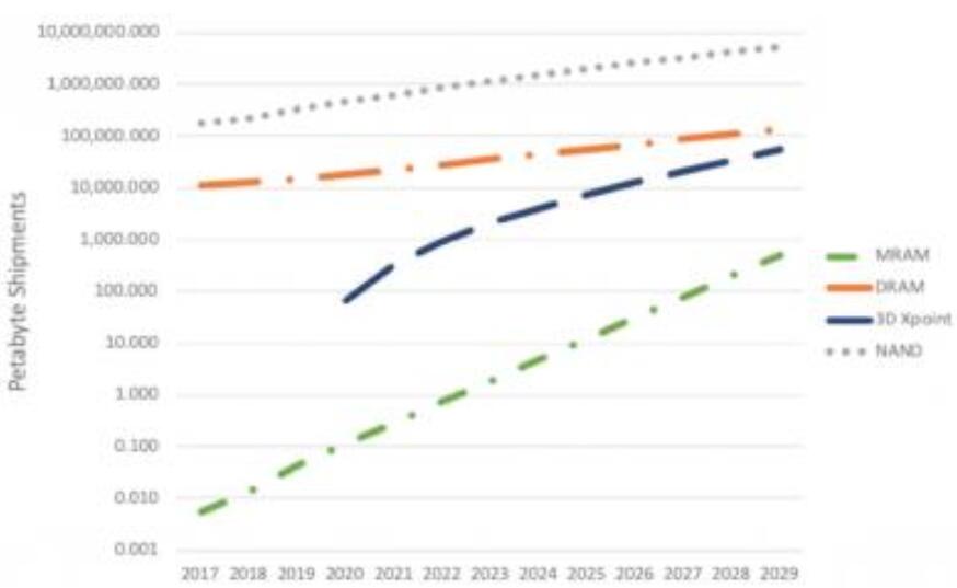MRAM容量出貨量預測(2017-2029,Coughlin)分析人士預計,包括DRAM,3DXpoint和NAND在內的許多存儲技術將在未來幾年內增長,但增長最快的將是MRAM存儲器。容量方面的出貨量預計將從2019年的約0.1PB增長到2029年的近100PB。