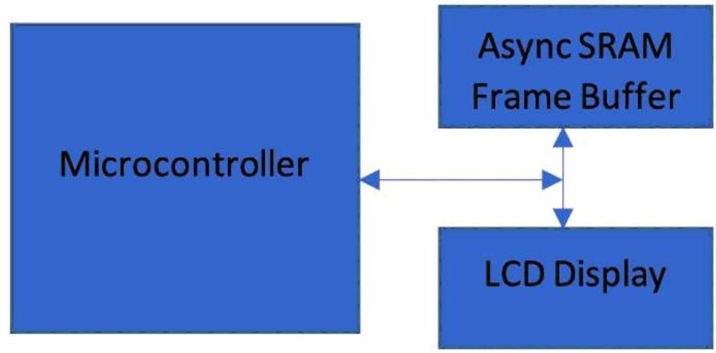 SRAM將無法提供足夠的容量或性能。為了避免畫面撕裂,也有必要采用雙緩存。在這些系統中通常在外部存儲器中實現幀緩存。在刷新周期中,從外部幀緩存讀取數據,并連同控制信號輸出給顯示控制器數據總線。圖1所示的是采用外部幀緩存的典型顯示框圖。