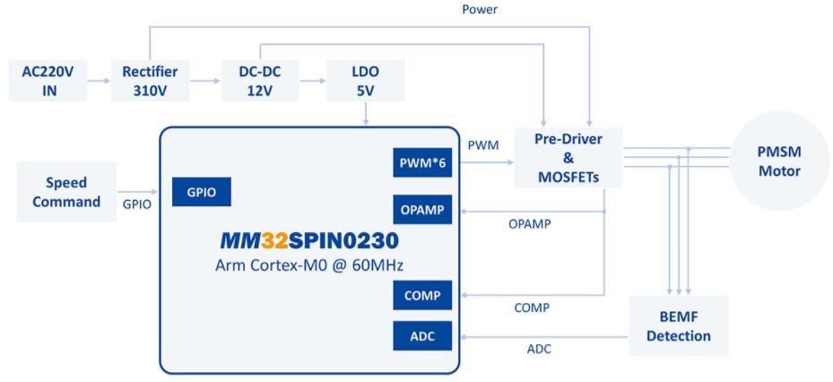 MM32SPIN0230為主控的低成本無刷高速吹風(fēng)機單片機方案。