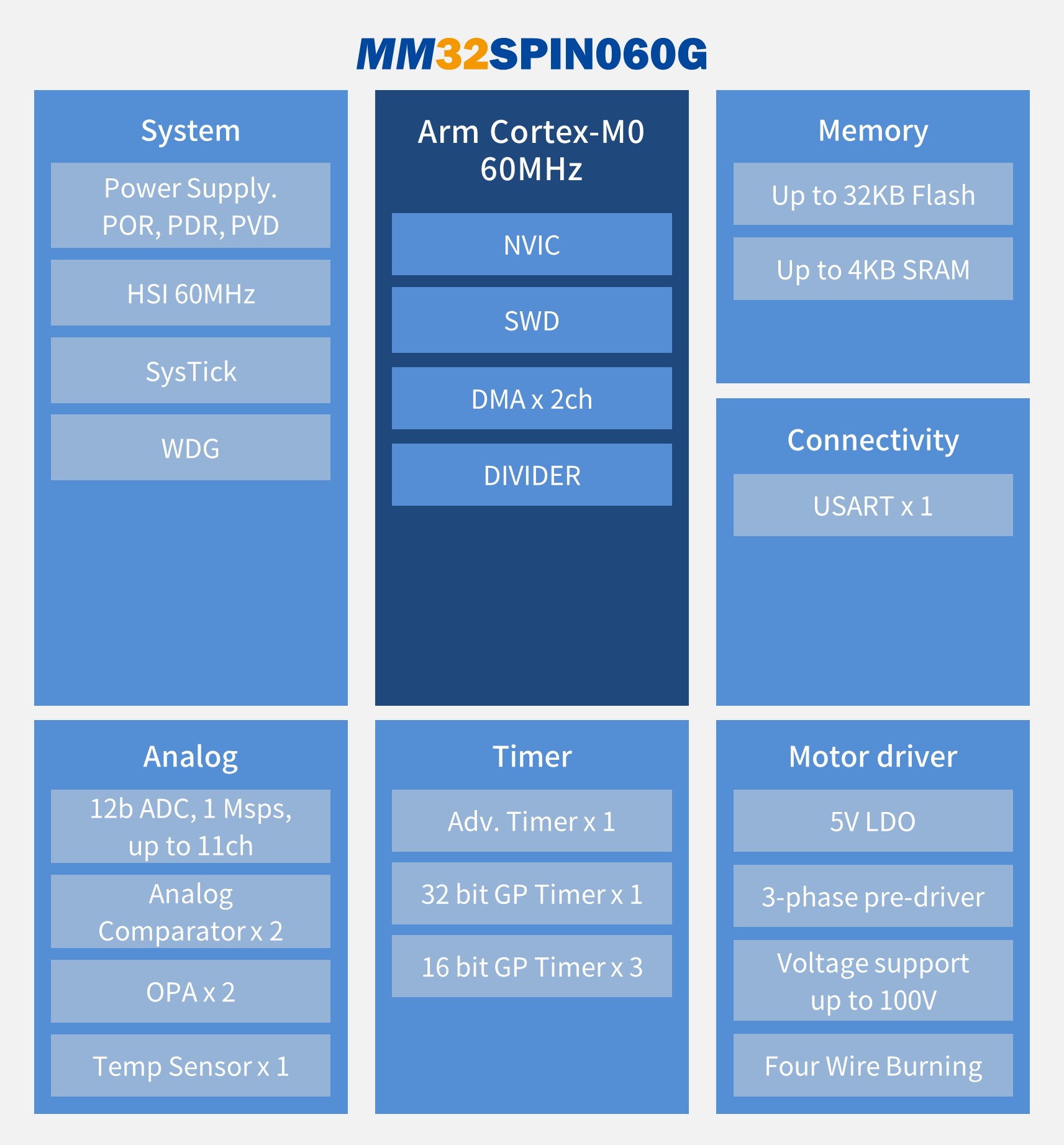 靈動(dòng)微電子MM32SPIN060G采用Cortex-M0內(nèi)核,專注于高性能單電機(jī)控制。集成了豐富的專用模擬外設(shè)和運(yùn)算資源,適合各類運(yùn)動(dòng)控制應(yīng)用。MM32SPIN060G是靈動(dòng)MindSPIN旗下高性能的單電機(jī)控制SOC產(chǎn)品,包括12位高精度ADC、2路模擬比較器COMP、2路運(yùn)算放大器OPAMP、三相N溝道柵極驅(qū)動(dòng)器,另配備有MC-TIM、硬件除法器HW-Div、DMA控制器等專用資源,以及32KB Flash、4KB SRAM、11個(gè)GPIO等基礎(chǔ)資源。