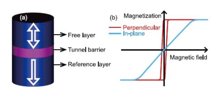 圖1(a)垂直磁各向異性的磁隧道結;(b)沿面內和垂直方向的磁化曲線,證明易磁化軸沿垂直方向。