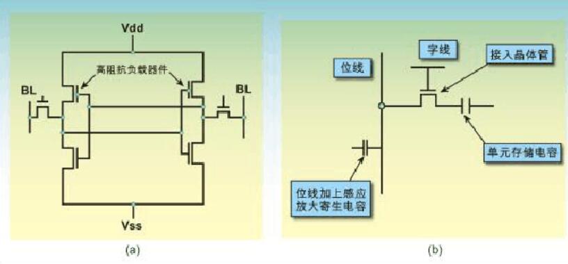 圖1a:典型的六晶體管靜態(tài)RAM存儲(chǔ)單元。圖1b:典型的單晶體管/單電容動(dòng)態(tài)存儲(chǔ)器存儲(chǔ)單元。
