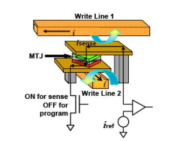 實現(xiàn)MRAM可靠存儲的一個主要障礙是高位干擾率。對目標(biāo)位進(jìn)行編程時,非目標(biāo)位中的自由層會被誤編程。目前飛思卡爾半導(dǎo)體研究人員已經(jīng)成功解決了此問題,其方法是,在每次出現(xiàn)位狀態(tài)空翻時,產(chǎn)生一個跳變位,它將磁矩的方向旋轉(zhuǎn)到同一方向。寫入線1和寫入線2上的反轉(zhuǎn)脈沖電流使極性旋轉(zhuǎn),從而不會干擾相同行或列的其它位元。